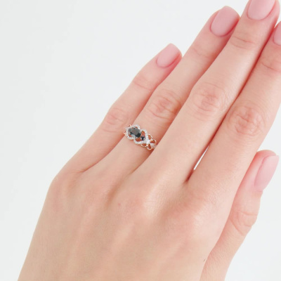 Кольцо с 32 бриллиантами природными, 0.06 карат, огранка круг 17 граней, цвет 2, чистота 2, тип огранки Б; 1 сапфиром природным, 0.43 карат, цвет 2, чистота 2, тип огранки Б; 2 сапфирами природными, 0.06 карат, цвет 2, чистота 2, тип огранки В; Розовое золото 585 пробы.