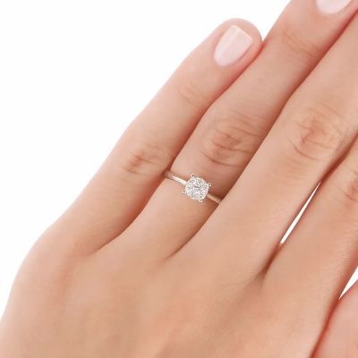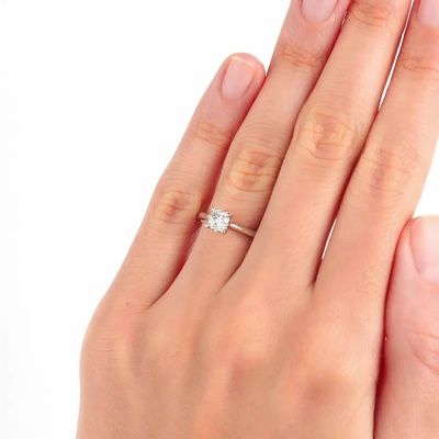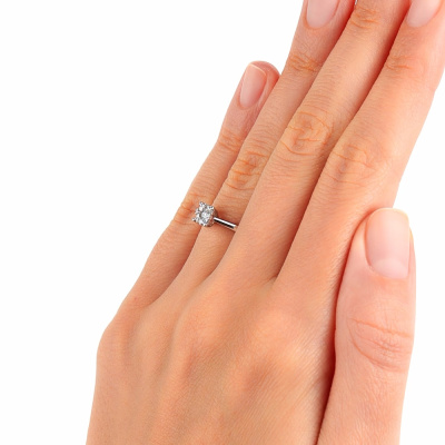 Кольцо из белого золота 585 пробы, украшенное 12 бриллиантами общим весом 0.087 карата и главным бриллиантов — 0,04 карата. Характеристики камней: • Цвет — 3 • Чистота — 5 • Огранка — круглая, 57 граней Это украшение воплощает элегантность и долговечность, идеально подходит для особых моментов в жизни.