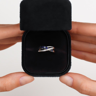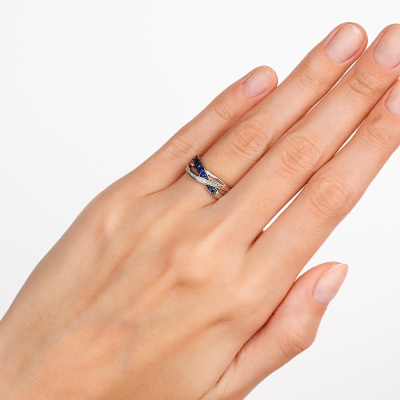 Элегантная классика в новом прочтении. Кольцо выполнено из белого золота с бриллиантами и сапфирами. Визуальный объем кольцу придают легкие, воздушные пересекающиеся линии.