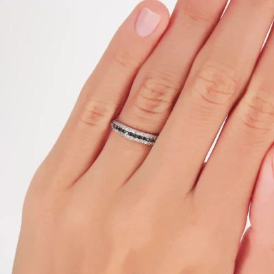 Это изысканное кольцо из белого золота 585 пробы обязательно станет центром вашей коллекции. Сочетание 36 бриллиантов общим весом 0.08 карата с круглой огранкой в 17 граней придает ему неповторимый сияющий блеск. Дополнено 12 черными бриллиантами весом 0.103 карата в 57 граней придают этому кольцу особую элегантность и изысканность. Цветовая гамма и чистота каждого бриллианта тщательно подобраны, чтобы создать идеальное сочетание. Это кольцо является прекрасным подарком для особого случая или для особенного человека в вашей жизни.