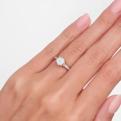 Кольцо с 1 бриллиантом природным, 0.07 карат, огранка круг 57 граней, цвет 3, чистота 6, тип огранки А; 6 бриллиантами природными, 0.11 карат, огранка круг 57 граней, цвет 3, чистота 6, тип огранки А; 6 бриллиантами природными, 0.04 карат, огранка круг 57 граней, цвет 3, чистота 6, тип огранки А; 18 бриллиантами природными, 0.05 карат, огранка круг 17 граней, цвет 2, чистота 2, тип огранки А; Белое золото 585 пробы.