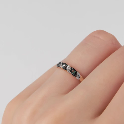 Кольцо с 8 бриллиантами природными, 0.01 карат, огранка круг 17 граней, цвет 2, чистота 2, тип огранки А; 3 изумрудами природными, 0.05 карат, цвет 3, чистота 3, тип огранки В; Розовое золото 585 пробы.