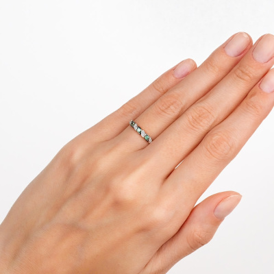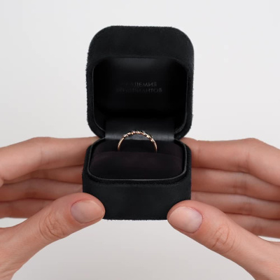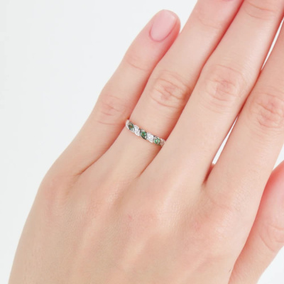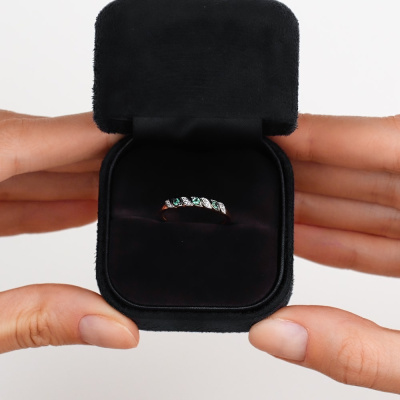 Универсальная классика. Кольцо выполнено из розового золота с дорожкой из бриллиантов и изумрудов. Нежное, утонченное, подойдет не только к деловому костюму, но и дополнит образ любой модницы.