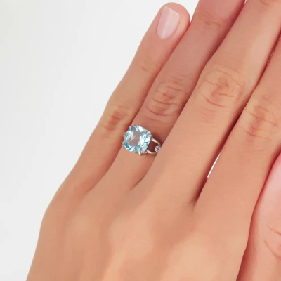 Кольцо с 10 бриллиантами природными, 0.02 карат, огранка круг 17 граней, цвет 2, чистота 2, тип огранки Б; 1 топазом скай природным, 2.64 карат; Белое золото 585 пробы.