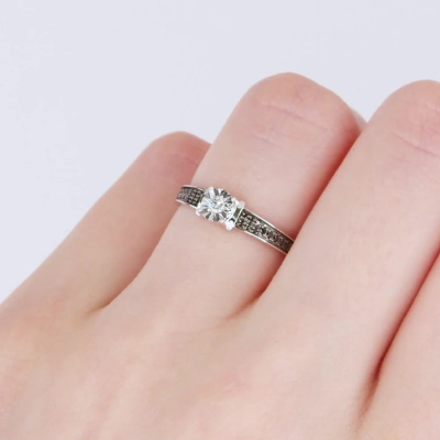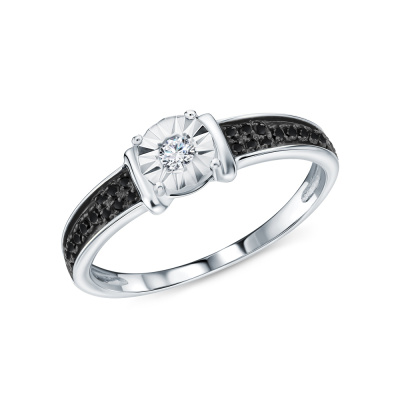 Кольцо с 1 бриллиантом природным, 0.03 карат, огранка круг 57 граней, цвет 4, чистота 5, тип огранки А; 12 бриллиантами черными природными облагороженными, 0.05 карат, огранка круг 57 граней, цвет 7, чистота 6, тип огранки А; 12 бриллиантами черными природными облагороженными, 0.03 карат, огранка круг 57 граней, цвет 7, чистота 6, тип огранки А; Белое золото 585 пробы.