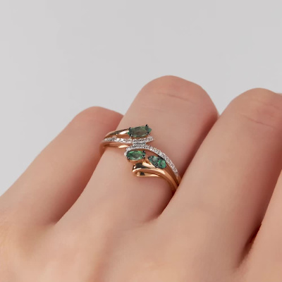 Кольцо с 26 бриллиантами природными, 0.05 карат, огранка круг 17 граней, цвет 2, чистота 3, тип огранки Б; 1 изумрудом природным, 0.12 карат, цвет 3, чистота 3, тип огранки Б; 1 изумрудом природным, 0.06 карат, цвет 3, чистота 3, тип огранки Б; 2 изумрудами природными, 0.03 карат, цвет 3, чистота 3, тип огранки В; Розовое золото 585 пробы.