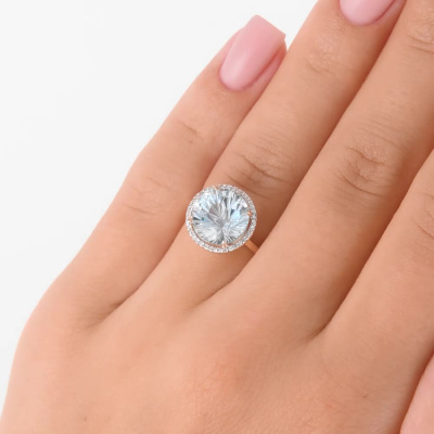 Кольцо «Бриллианты Якутии» с 1 топаз, 4.419 карат, тип огранки В; 38 бриллиантами, 0.084 карат, огранка круг 17 граней, цвет 2, чистота 2, тип огранки Б; Розовое золото 585 пробы.