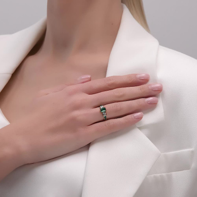 Кольцо с двумя бриллиантами, общим весом 0.039 карата, отразит неподдельную элегантность. Характеристики бриллиантов: • Цвет — 3 • Чистота — 6 • Тип огранки — А, 57 граней Кольцо также украшено шестью гидротермальными изумрудами общим весом 0.235 карат и одним изумрудом весом 0.478 карат. Эти изумруды имеют тип огранки Б, придающий им уникальную форму и эффект. Украшение изготовлено из золота 585 пробы, обеспечивая надежность и долговечность. Это идеальный аксессуар для стильного образа и олицетворение изысканности.