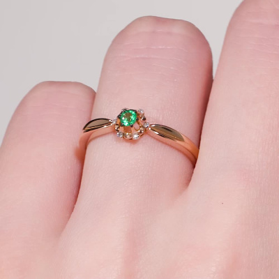 Кольцо с 6 бриллиантами природными, 0.01 карат, огранка круг 17 граней, цвет 2, чистота 2, тип огранки Б; 1 изумрудом природным, 0.07 карат, цвет 3, чистота 3, тип огранки В; Розовое золото 585 пробы.