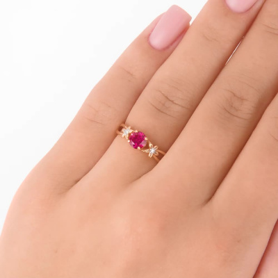 Кольцо с 1 рубином синтетическим, 0.6 карат, тип огранки В; 2 бриллиантами, 0.01 карат, огранка круг 17 граней, цвет 2, чистота 2, тип огранки Б; Розовое золото 585 пробы.