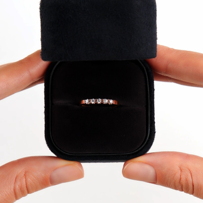 Это изысканное золотое кольцо, украшенное пятью бриллиантами, выполнено в России. Бриллианты имеют круглую огранку с 57 гранями, общий вес составляет 0,14 карата. Цвет камней - 4, чистота - 6, тип огранки - А. Кольцо выполнено из розового золота 585 пробы, вес изделия - 1,15 г. При покупке вы получаете пожизненную гарантию.