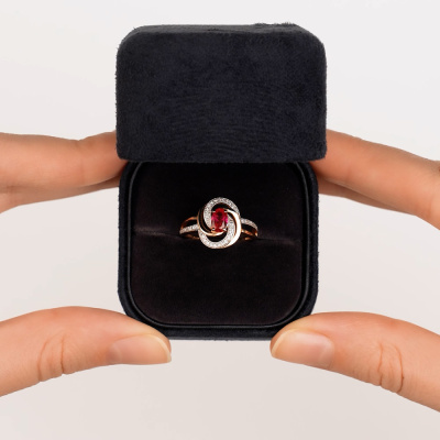 Кольцо с 40 бриллиантами природными, 0.085 карат, огранка круг 17 граней, цвет 2, чистота 2, тип огранки Б; 1 рубином синтетическим, 0.469 карат; Розовое золото 585 пробы.