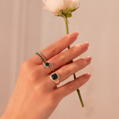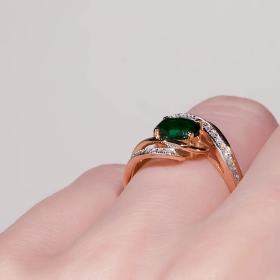 Кольцо с 31 бриллиантом природным, 0.1 карат, огранка круг 17 граней, цвет 2, чистота 2, тип огранки Б; 1 гидротермальным изумрудом, 0.71 карат, тип огранки Б; Розовое золото 585 пробы.
