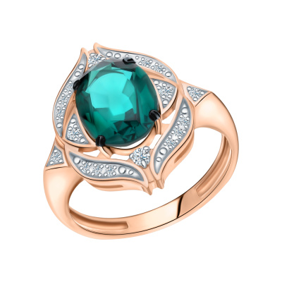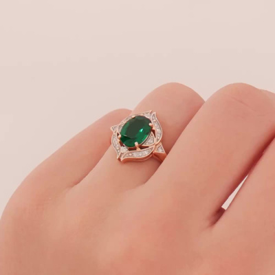 Кольцо с 2 бриллиантами природными, 0.02 карат, огранка круг 17 граней, цвет 2, чистота 2, тип огранки Б; 4 бриллиантами природными, 0.03 карат, огранка круг 17 граней, цвет 2, чистота 2, тип огранки Б; 12 бриллиантами природными, 0.04 карат, огранка круг 17 граней, цвет 2, чистота 2, тип огранки Б; 1 гидротермальным изумрудом, 1.7 карат; Розовое золото 585 пробы.