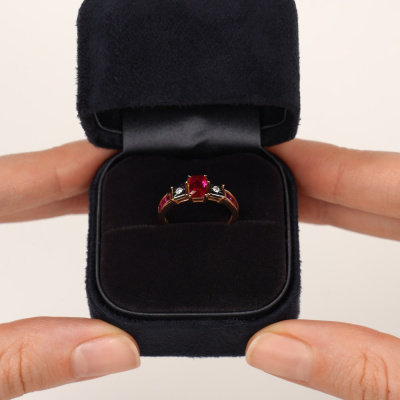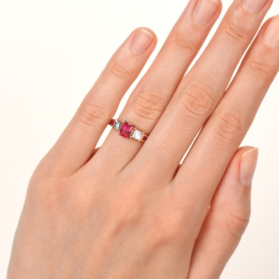 Кольцо «Бриллианты Якутии» с 1 рубином синтетическим, 0.621 карат, тип огранки Б; 6 рубинами синтетическими, 0.326 карат, тип огранки Б; 2 бриллиантами, 0.039 карат, огранка круг 57 граней, цвет 3, чистота 6, тип огранки А; Розовое и белое золото 585 пробы.