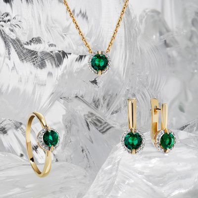 Кольцо «Бриллианты Якутии» с 1 гидротермальным изумрудом , 0.421 карат, тип огранки В; 14 бриллиантами, 0.05 карат, огранка круг 17 граней, цвет 2, чистота 2, тип огранки Б; Желтое золото 585 пробы.