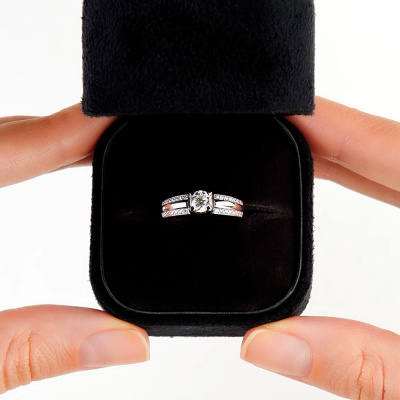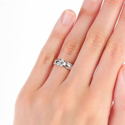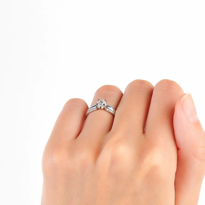 Кольцо с 1 бриллиантом природным, 0.402 карат, огранка круг 57 граней, цвет 4, чистота 6; 28 бриллиантами природными, 0.097 карат, огранка круг 57 граней, цвет 4, чистота 6; Белое золото 585 пробы.
