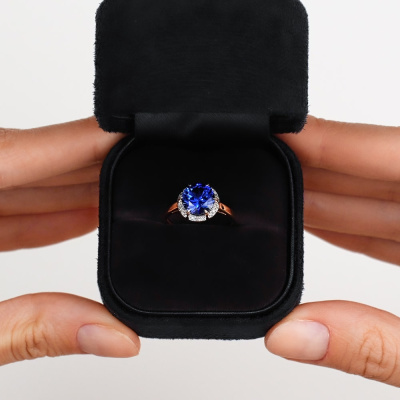 Кольцо с 18 бриллиантами природными, 0.05 карат, огранка круг 17 граней, цвет 2, чистота 2, тип огранки Б; 1 сапфиром синтетическим, 2.24 карат; Розовое золото 585 пробы.