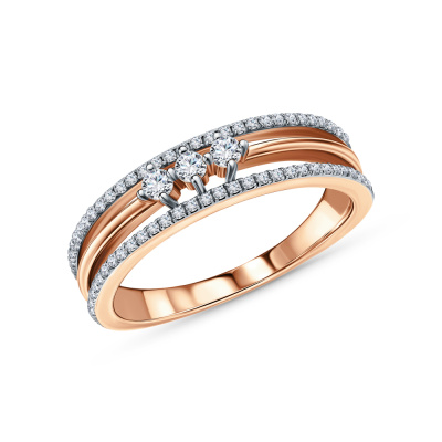 Кольцо с 3 бриллиантами природными, 0.11 карат, огранка круг 57 граней, цвет 4, чистота 6, тип огранки А; 62 бриллиантами природными, 0.2 карат, огранка круг 57 граней, цвет 4, чистота 6, тип огранки А; Розовое золото 585 пробы.