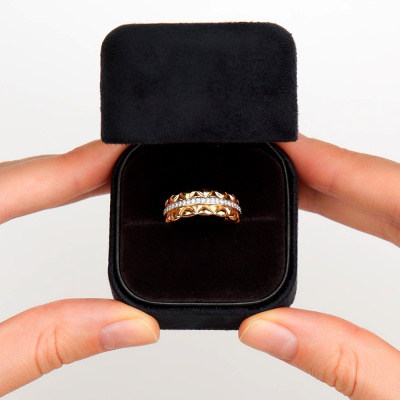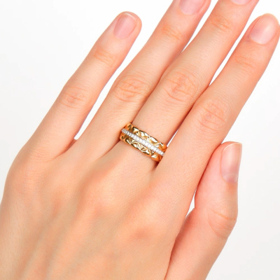 Кольцо с 26 бриллиантами природными, 0.15 карат, огранка круг 57 граней, цвет 4, чистота 6, тип огранки А; Желтое золото 585 пробы.