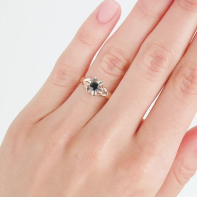 Кольцо из розового золота с сапфирами выполнено в романтическом стиле. Накладка из белого золота в форме цветка добавляет объем кольцу и подчеркивает красоту камня.