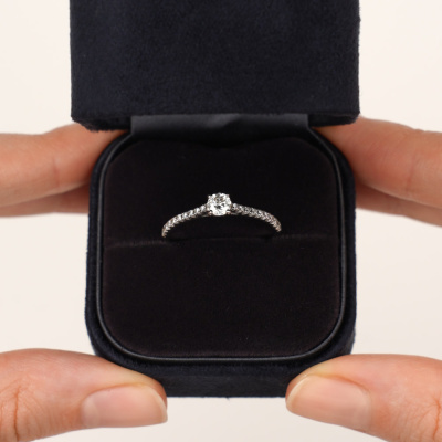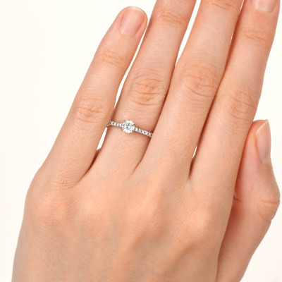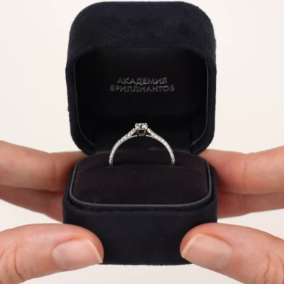 Кольцо с 1 бриллиантом природным, 0.302 карат, огранка круг 57 граней, цвет 4, чистота 7; 20 бриллиантами природными, 0.132 карат, огранка круг 57 граней, цвет 3, чистота 6; Белое золото 585 пробы.