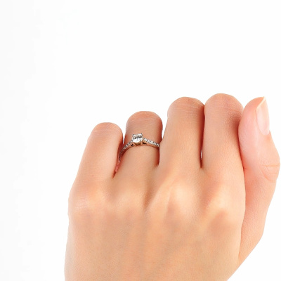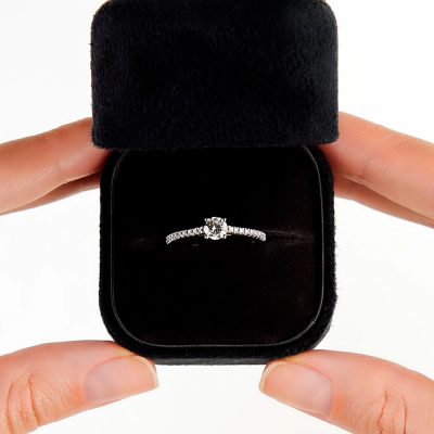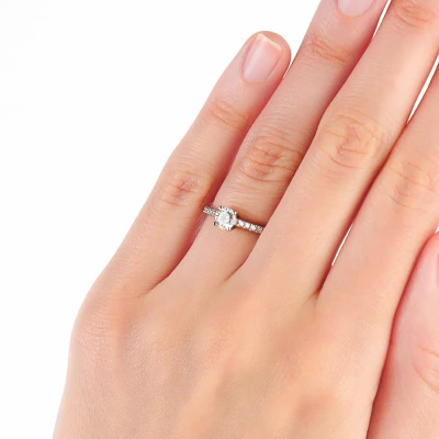 Кольцо с 1 бриллиантом природным, 0.402 карат, огранка круг 57 граней, цвет 4, чистота 7, тип огранки А; 20 бриллиантами природными, 0.132 карат, огранка круг 57 граней, цвет 3, чистота 6, тип огранки А; Белое золото 585 пробы.