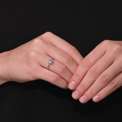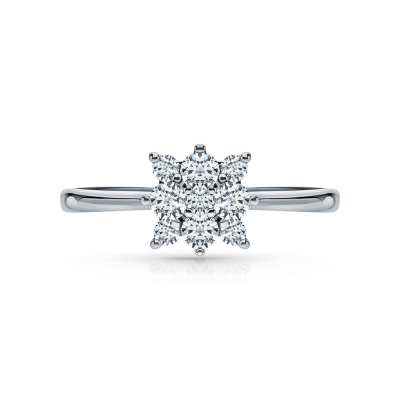 Кольцо с 4 бриллиантами природными, 0.27 карат, огранка круг 57 граней, цвет 3, чистота 6, тип огранки А; 5 бриллиантами природными, 0.11 карат, огранка круг 57 граней, цвет 3, чистота 6, тип огранки А; Белое золото 585 пробы.
