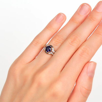 Золотое кольцо с сапфиром и бриллиантами - изысканное украшение, которое подчеркнет вашу индивидуальность и стиль. Кольцо выполнено из белого золота 585 пробы и украшено 28 бриллиантами общим весом 0.067 карат. Центральная вставка представлена синтетическим сапфиром весом 1.053 карат. Огранка круга с 17 гранями придает камням блеск и сияние. Это элегантное кольцо станет прекрасным дополнением к вашему образу и привлечет восхищенные взгляды.