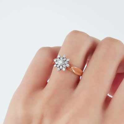 Кольцо с 1 бриллиантом природным, 0.17 карат, огранка круг 57 граней, цвет 3, чистота 6, тип огранки А; 16 бриллиантами природными, 0.19 карат, огранка круг 57 граней, цвет 3, чистота 6, тип огранки А; Розовое и белое золото 585 пробы.