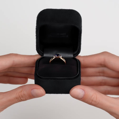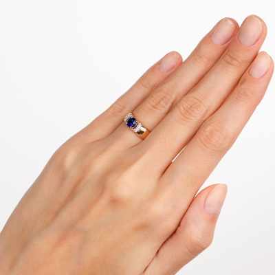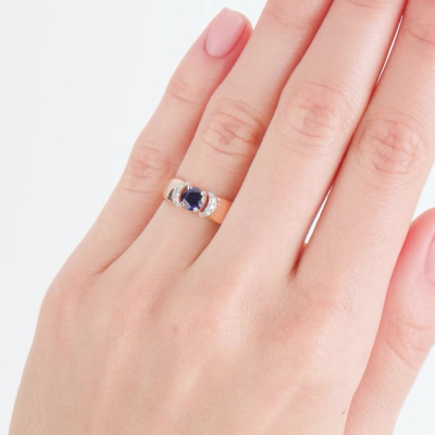 Кольцо с 1 сапфиром синтетическим, 0.605 карат, тип огранки В; 2 бриллиантами, 0.015 карат, огранка круг 17 граней, цвет 2, чистота 2, тип огранки Б; 4 бриллиантами, 0.018 карат, огранка круг 17 граней, цвет 2, чистота 2, тип огранки Б; 4 бриллиантами, 0.01 карат, огранка круг 17 граней, цвет 2, чистота 2, тип огранки Б; Розовое золото 585 пробы.