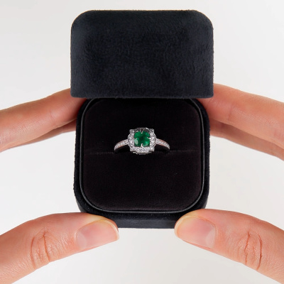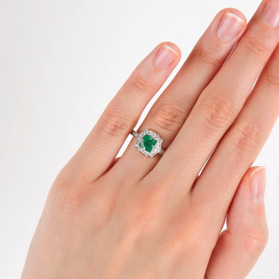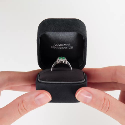 Кольцо с 8 бриллиантами природными, 0.06 карат, огранка круг 57 граней, цвет 3, чистота 6, тип огранки А; 34 бриллиантами природными, 0.21 карат, огранка круг 57 граней, цвет 3, чистота 6, тип огранки А; 1 изумрудом природным, 0.69 карат, цвет 3, чистота 3, тип огранки В; Белое золото 585 пробы.