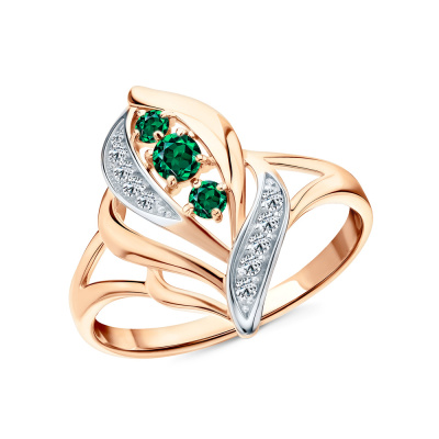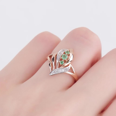 Кольцо с 9 бриллиантами природными, 0.07 карат, огранка круг 17 граней, цвет 2, чистота 2, тип огранки А; 1 изумрудом природным, 0.09 карат, цвет 3, чистота 3, тип огранки В; 2 изумрудами природными, 0.06 карат, цвет 3, чистота 3, тип огранки В; Розовое золото 585 пробы.