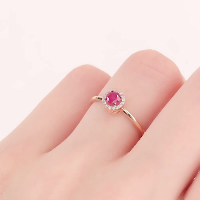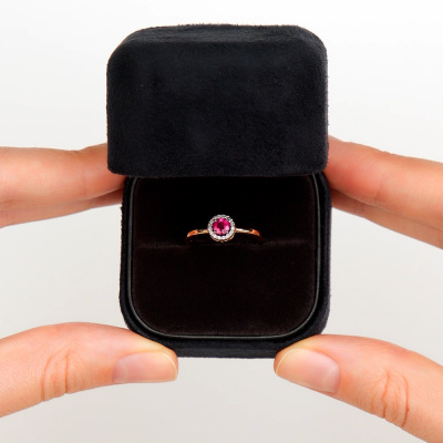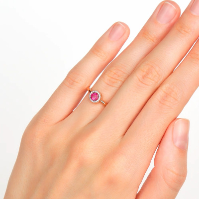 Кольцо с 16 бриллиантами природными, 0.05 карат, огранка круг 17 граней, цвет 2, чистота 2, тип огранки А; 1 рубином природным, 0.32 карат, цвет 2, чистота 2, тип огранки В; Розовое золото 585 пробы.