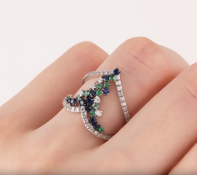 Кольцо с 5 бриллиантами природными, 0.07 карат, огранка круг 57 граней, цвет 3, чистота 6, тип огранки А; 43 бриллиантами природными, 0.17 карат, огранка круг 17 граней, цвет 2, чистота 2, тип огранки А; 4 сапфирами природными, 0.15 карат, цвет 2, чистота 2, тип огранки В; 5 сапфирами природными, 0.13 карат, цвет 2, чистота 2, тип огранки В; 2 сапфирами природными, 0.04 карат, цвет 2, чистота 2, тип огранки В; 2 изумрудами природными, 0.03 карат, цвет 3, чистота 3, тип огранки В; 8 изумрудами природными, 0.09 карат, цвет 3, чистота 3, тип огранки В; Белое золото 585 пробы.
