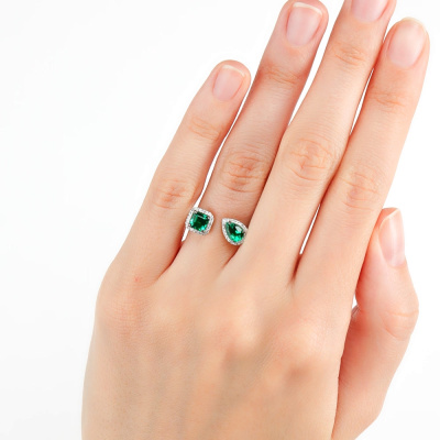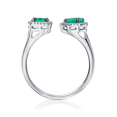 Кольцо с 46 бриллиантами природными, 0.09 карат, огранка круг 17 граней, цвет 2, чистота 2, тип огранки А; 1 гидротермальным изумрудом, 0.37 карат, тип огранки Б; 1 гидротермальным изумрудом, 0.36 карат, тип огранки Б; Белое золото 585 пробы.