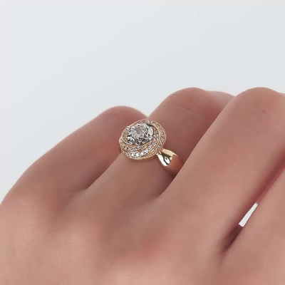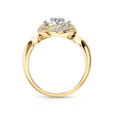 Кольцо с 1 бриллиантом, 0.03 карат, огранка круг 57 граней, цвет 4, чистота 5, тип огранки А; 6 бриллиантами, 0.05 карат, огранка круг 57 граней, цвет 4, чистота 5, тип огранки А; 44 бриллиантами, 0.2 карат, огранка круг 57 граней, цвет 4, чистота 5, тип огранки А; Желтое и белое золото 585 пробы.