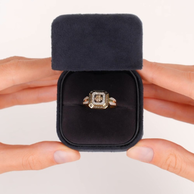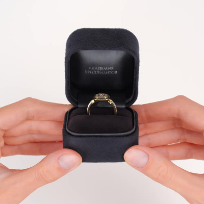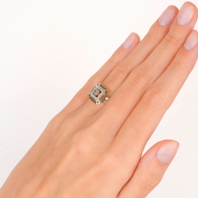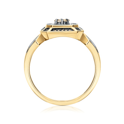 Кольцо с 1 бриллиантом коньячным, 0.03 карат, огранка круг 57 граней, цвет 7, чистота 6, тип огранки А; 6 бриллиантами коньячными, 0.04 карат, огранка круг 57 граней, цвет 7, чистота 6, тип огранки А; 36 бриллиантами, 0.18 карат, огранка круг 57 граней, цвет 4, чистота 5, тип огранки А; 24 бриллиантами коньячными, 0.05 карат, огранка круг 57 граней, цвет 7, чистота 6, тип огранки А; Желтое и белое золото 585 пробы.