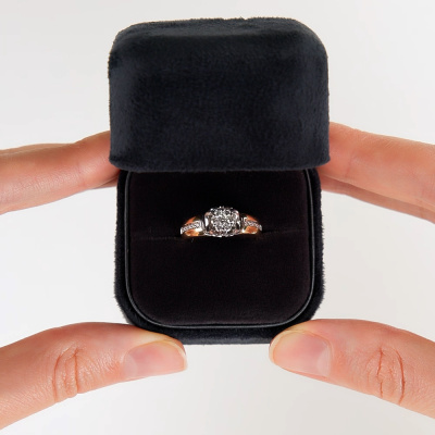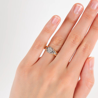 Кольцо с 1 бриллиантом природным, 0.06 карат, огранка круг 57 граней, цвет 4, чистота 5, тип огранки А; 6 бриллиантами природными, 0.13 карат, огранка круг 57 граней, цвет 4, чистота 5, тип огранки А; 1 бриллиантом природным, 0.005 карат, огранка круг 57 граней, цвет 4, чистота 5, тип огранки А; 11 бриллиантами природными, 0.02 карат, огранка круг 57 граней, цвет 4, чистота 5, тип огранки А; Желтое и белое золото 585 пробы.