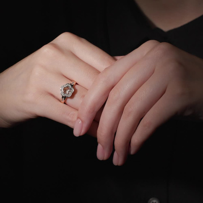 Кольцо с 1 бриллиантом природным, 0.02 карат, огранка круг 57 граней, цвет 4, чистота 5, тип огранки А; 31 бриллиантом природным, 0.08 карат, огранка круг 17 граней, цвет 2, чистота 3, тип огранки А; Розовое и белое золото 585 пробы.