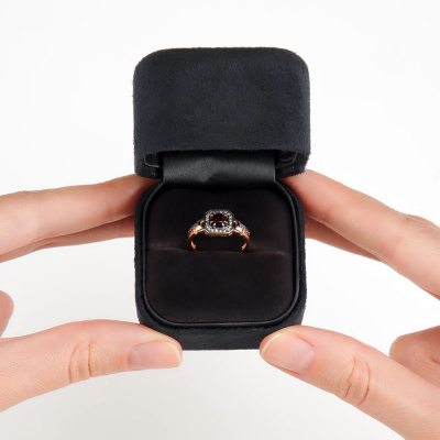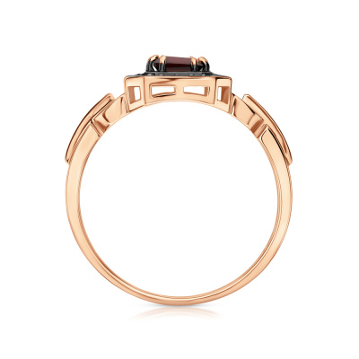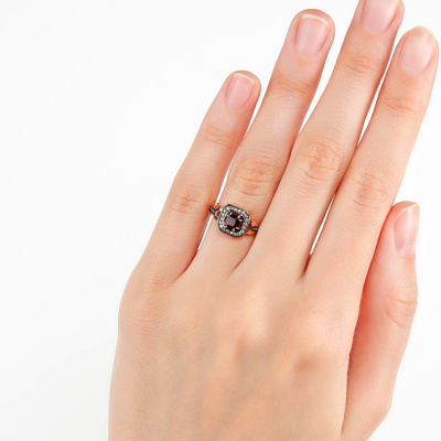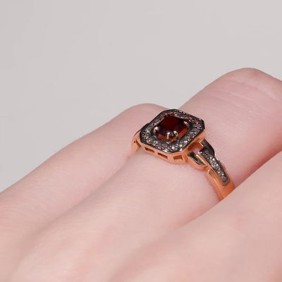 Кольцо с 1 гранатом природным, 0.42 карат; 20 бриллиантами коньячными природными, 0.06 карат, огранка круг 57 граней, цвет 7, чистота 5, тип огранки А; 10 бриллиантами коньячными природными, 0.02 карат, огранка круг 57 граней, цвет 7, чистота 5, тип огранки А; Розовое золото 585 пробы.