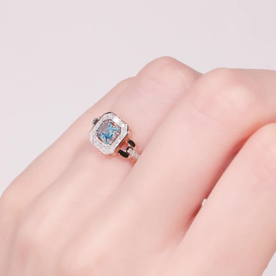 Кольцо с 20 бриллиантами природными, 0.07 карат, огранка круг 17 граней, цвет 2, чистота 2, тип огранки А; 10 бриллиантами природными, 0.02 карат, огранка круг 17 граней, цвет 2, чистота 2, тип огранки А; 1 топазом свисс природным, 0.39 карат; Розовое золото 585 пробы.