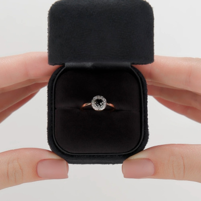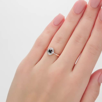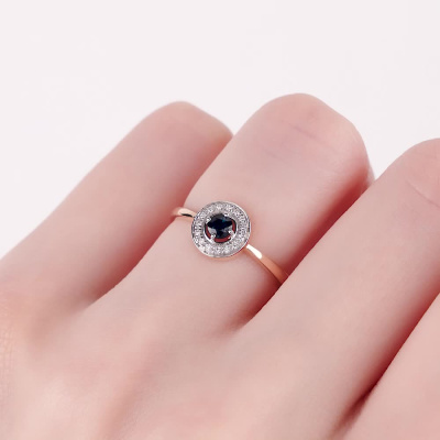 Кольцо с 15 бриллиантами природными, 0.04 карат, огранка круг 17 граней, цвет 2, чистота 2, тип огранки А; 1 сапфиром природным, 0.23 карат, цвет 2, чистота 2, тип огранки В; Розовое золото 585 пробы.