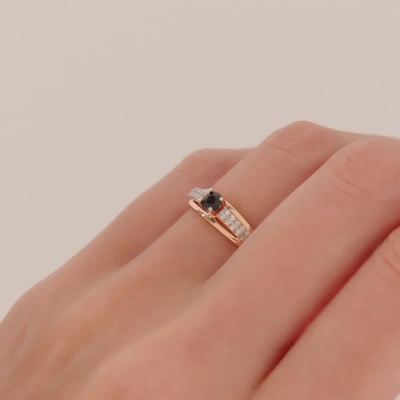 Кольцо с 28 бриллиантами природными, 0.08 карат, огранка круг 17 граней, цвет 2, чистота 2, тип огранки А; 1 сапфиром природным, 0.22 карат, цвет 2, чистота 2, тип огранки В; Розовое золото 585 пробы.