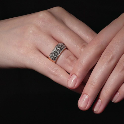 Кольцо с 20 бриллиантами природными, 0.09 карат, огранка круг 17 граней, цвет 2, чистота 2, тип огранки А; 36 бриллиантами природными, 0.09 карат, огранка круг 17 граней, цвет 2, чистота 2, тип огранки А; Розовое и белое золото 585 пробы.