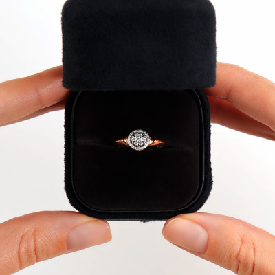 Кольцо с 1 бриллиантом природным, 0.01 карат, огранка круг 57 граней, цвет 4, чистота 6; 6 бриллиантами природными, 0.03 карат, огранка круг 57 граней, цвет 4, чистота 6; 22 бриллиантами природными, 0.04 карат, огранка круг 17 граней, цвет 2, чистота 2; Розовое золото 585 пробы.