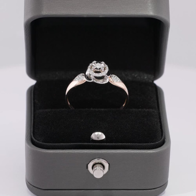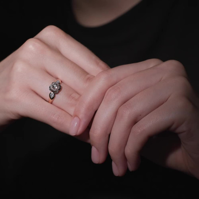 Кольцо с 1 бриллиантом природным, 0.03 карат, огранка круг 57 граней, цвет 3, чистота 6, тип огранки А; 6 бриллиантами природными, 0.04 карат, огранка круг 57 граней, цвет 3, чистота 6, тип огранки А; 16 бриллиантами природными, 0.07 карат, огранка круг 17 граней, цвет 2, чистота 2, тип огранки А; Розовое и белое золото 585 пробы.
