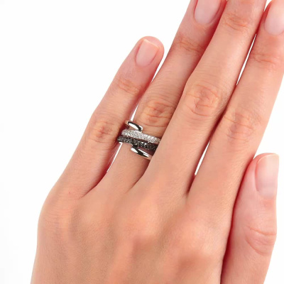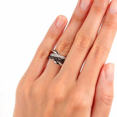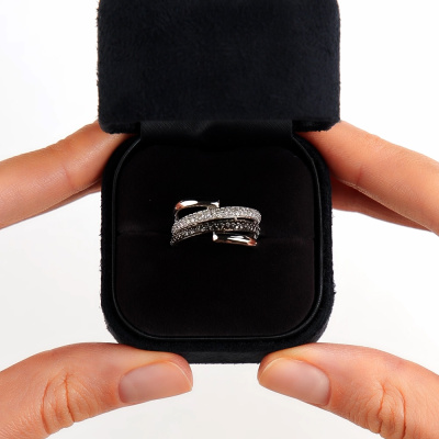 Кольцо с 51 бриллиантом природным, 0.25 карат, огранка круг 17 граней, цвет 2, чистота 2; 51 бриллиантом черным природным облагороженным, 0.25 карат, огранка круг 57 граней, цвет 7, чистота 6; Белое золото 585 пробы.