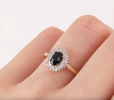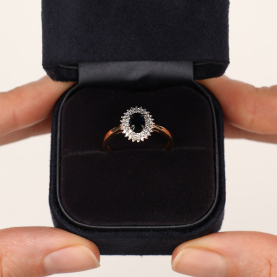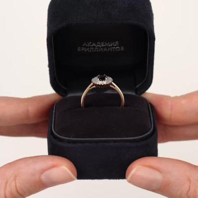 Кольцо с 42 бриллиантами природными, 0.17 карат, огранка круг 17 граней, цвет 2, чистота 2, тип огранки А; 1 сапфиром природным, 0.62 карат, цвет 2, чистота 2, тип огранки Б; Розовое золото 585 пробы.