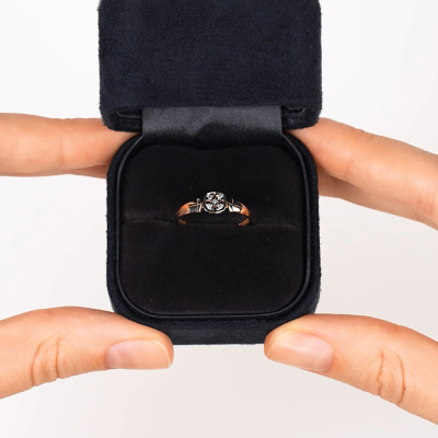 Кольцо с 4 бриллиантами природными, 0.03 карат, огранка круг 57 граней, цвет 4, чистота 6, тип огранки А; 1 бриллиантом природным, 0.005 карат, огранка круг 17 граней, цвет 2, чистота 2, тип огранки А; Розовое и белое золото 585 пробы.